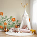 Förnya ditt barns rum till en gullig kokong med denna barn tapet dekorerad med delikata blommor och lugnande lövverk. De orange blommorna blommar graciöst längs slingrande vinstockar, skapar en varm och välkomnande atmosfär. Denna blomsterdekoration ger en touch av naturen samtidigt som den förblir mjuk och subtil.