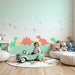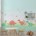 Dinosaurierna, målade i pastellfärger av grönt och rosa, är ackompanjerade av glittrande stjärnor som lägger till en touch av magi till hela rummet. Varje detalj, från dinosauriernas leenden till de mjuka formerna av stjärnorna, är utformade för att stimulera nyfikenhet och förundran hos de små.