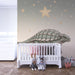 De mjuka och lugnande nyanserna i bakgrunden skapar en fridfull atmosfär, perfekt för avkoppling och sömn. De gyllene stjärnorna lägger till en touch av magi, vilket gör detta rum till en riktig drömvärld för din lilla utforskare.