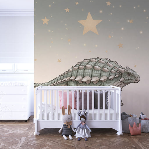 Visa alla detaljerBarntapet | Leende dinosaurie under en pastellstjärnhimmel