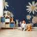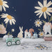 Den djupa och lugnande bakgrunden framhäver pastellfärgerna och ger en harmonisk kontrast som inbjuder till drömmar. Varje detalj, från de delikata blommorna till de livliga karaktärerna, är utformad för att stimulera nyfikenhet och ge en touch av magi till ditt barns utrymme.