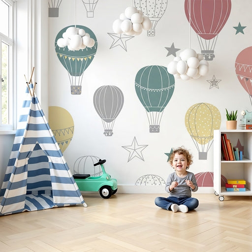 Visa alla detaljerBarntapet | Färgglada luftballonger över en pastellvågig landskap