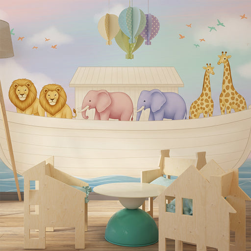 Visa alla detaljerBarntapet | Färgglada djur på en båt med en pastellfärgad himmel