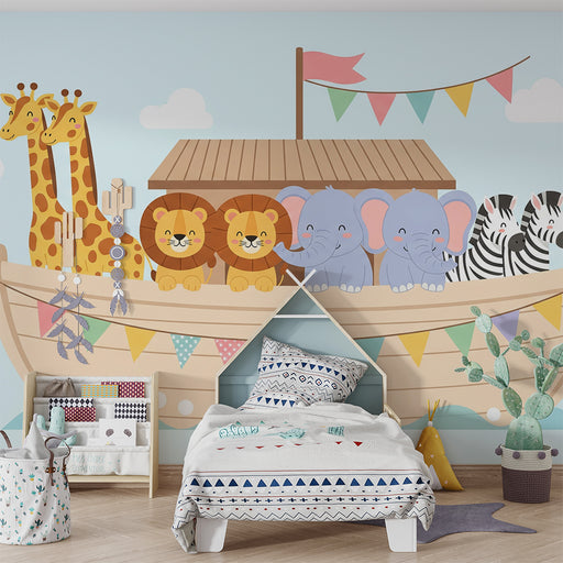 KidsWallTransformez la chambre de votre bébé en un monde magique avec ce papier peint pour bébé illustrant une joyeuse scène d'animaux sur un bateau. Sous ...