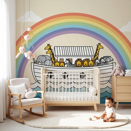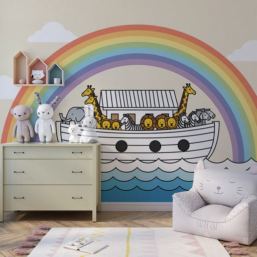 Visa alla detaljerPapier peint chambre bébé | Animaux mignons sur un bateau sous un arc-en-ciel