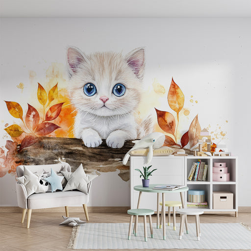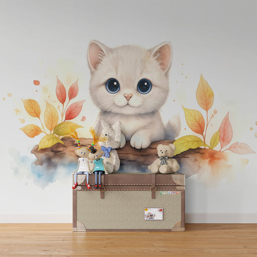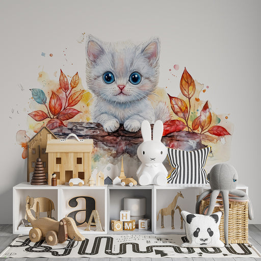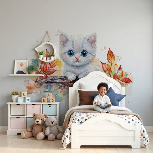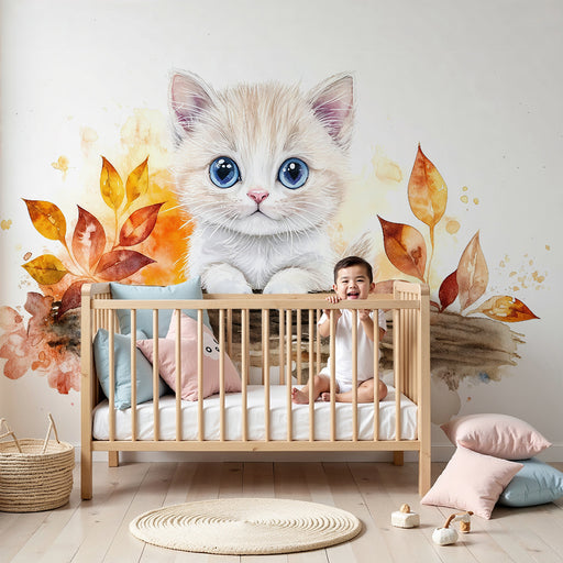 KidsWallLägg till en touch av mjukhet och charm i ditt barns rum med vår barntapet med akvarellkatt och höstlöv. Denna design visar en bedårande kattunge m...