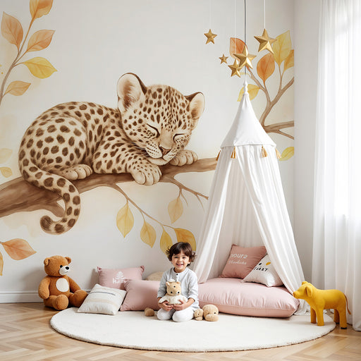 KidsWallOmvandla din bebis rum till en fristad av frid med vår barn tapet liten leopard och höstliga grenar. Denna bedårande design visar en sovande bebisl...