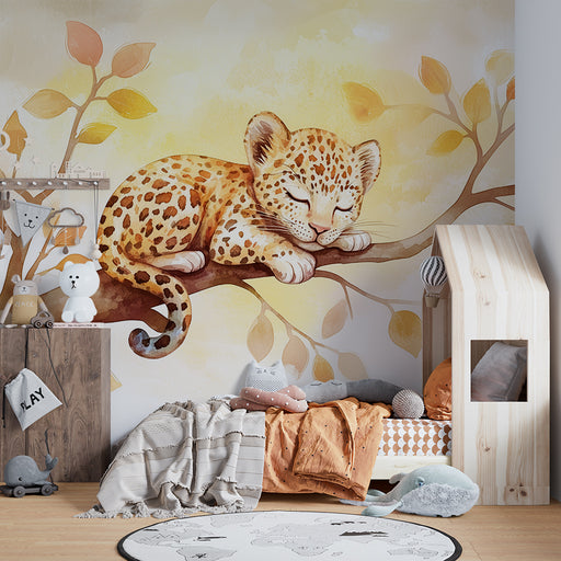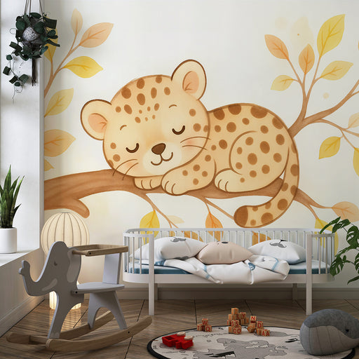 KidsWallTillsätt en touch av sötma och natur till ditt barns rum med vår bedårande tapet som visar en liten sovande leopard på en gren. Denna ömtåliga desi...