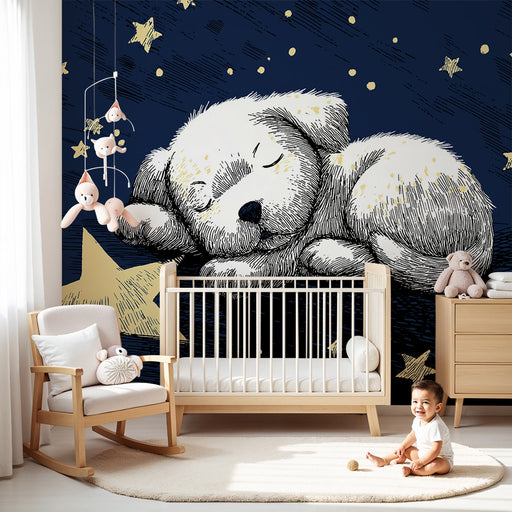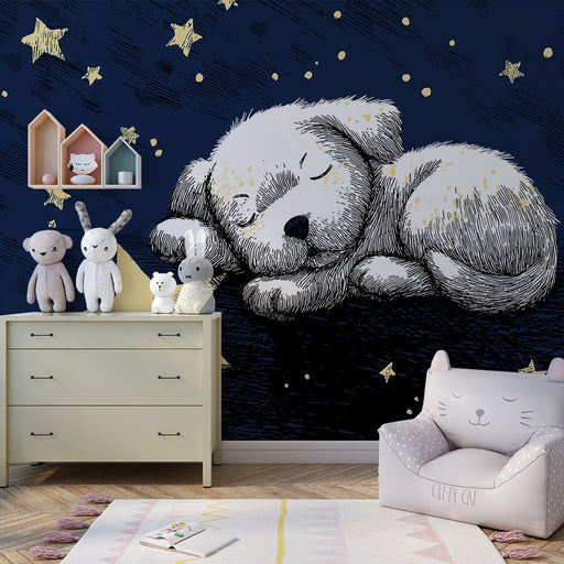 KidsWallSkapa en mjuk och lugnande miljö för din baby med denna barntapet som visar en bedårande sovande valp. Omgiven av glittrande stjärnor mot en mörkbl...