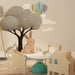 Det minimalistiska designen, med delikata moln i bakgrunden, främjar en lugn och tröstande miljö, perfekt för vila och lek. Varje detalj, från kaninens päls till träds blad, är noggrant illustrerad för att stimulera din lilla barns fantasi.