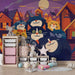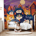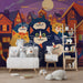 Lägg till en touch av glädje i ditt barns rum med vår glada katt tapet i skymningen. Denna bedårande scen framhäver leende katter framför varma färgade hus, skapar en inbjudande atmosfär.
