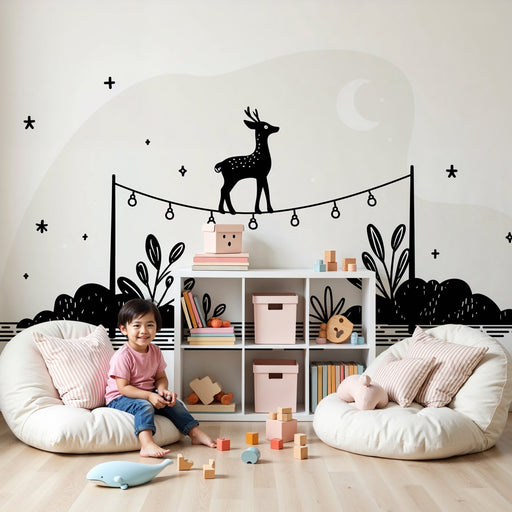 KidsWallOmvandla ditt barns rum till en sagovärld med denna barn tapet som visar en majestätisk hjort på en upplyst rep, omgiven av en stjärnklar nattlig a...