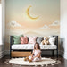 Återskapa ditt barns rum till en alltför gullig plats med denna barnrumstapet som representerar en mjuk och lugnande himmel. Leende moln flyter fridfullt under en gyllene måne och skapar en lugnande och tröstande atmosfär. Pastellfärgerna i rosa och blått för tankarna till en magisk solnedgång, perfekt för att lugna ditt lilla barn under natten.
