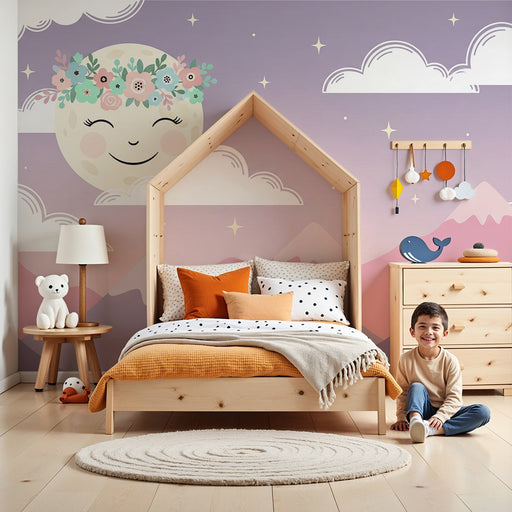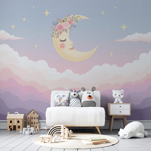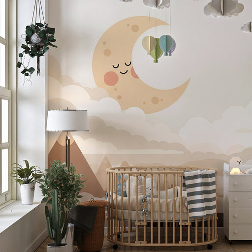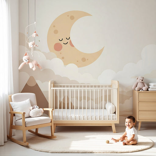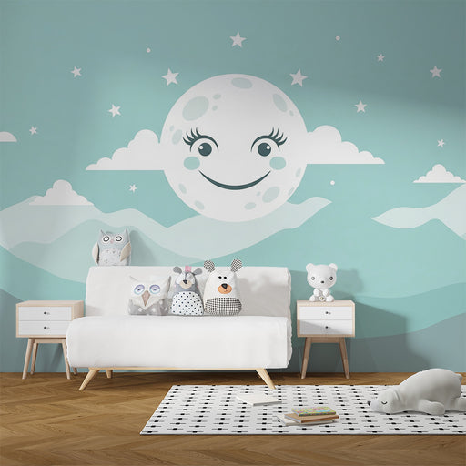 KidsWallOmforma ditt barns rum till en alldeles för gullig plats med denna barntapet som illustrerar en leende måne som hänger från en fluffig moln. I en l...