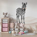 Nyanserna av beige och kräm ger en touch av värme, medan zebran, med sina distinkta ränder och bedårande blick, blir rummets fokuspunkt. Denna fängslande dekor stimulerar fantasin och inbjuder till upptäckt, perfekt för att väcka de små barnens nyfikenhet.
