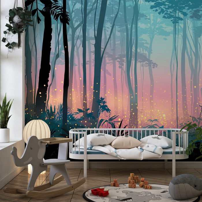 Omvandla ditt barns rum till en riktig sagovärld med denna barn tapet som representerar en förtrollad skog. Silhuetterna av majestätiska träd stiger upp mot en himmel i pastellfärger, medan gnistrande ljus försiktigt lyser upp skogen. En förtrollande dekoration som stimulerar fantasin och skapar en magisk atmosfär.