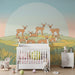 Den lugnande bakgrunden, med nyanser av blått och rosa, skapar en mjuk och varm atmosfär, perfekt för din lilla att sova och drömma. Varje detalj, från rådjuren till grässtråna, är noggrant illustrerad för att tillföra en touch av magi och förundran till rummet.