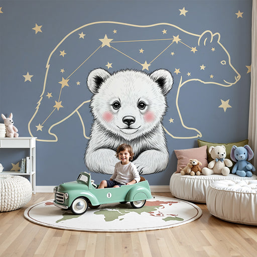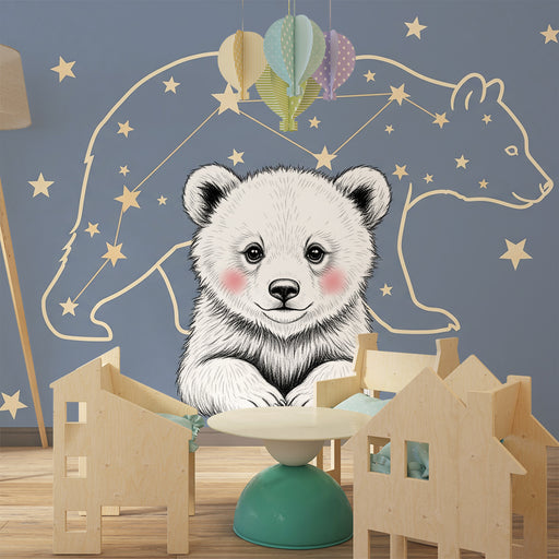Transformera ditt barns rum till en verklig rymdresa med denna barn tapet som visar en björn ritad som en stjärnbild. På en nattblå bakgrund bildar...