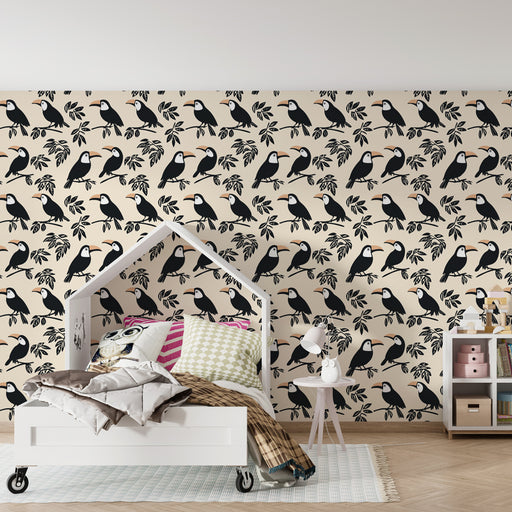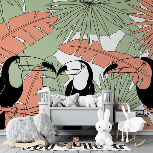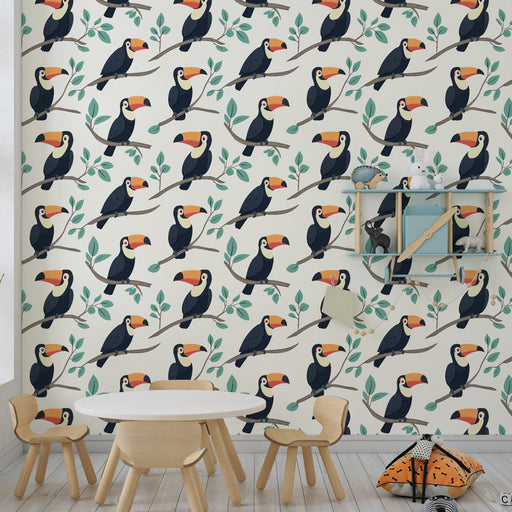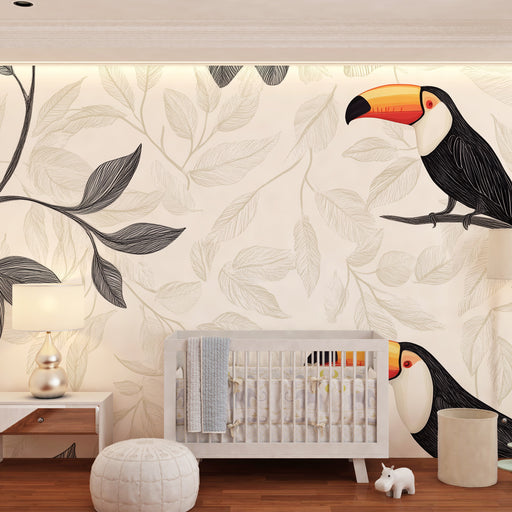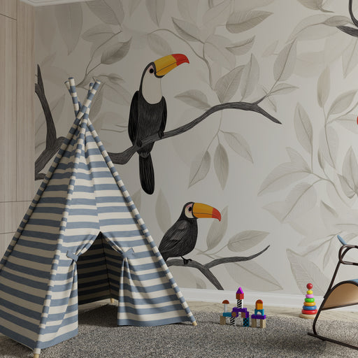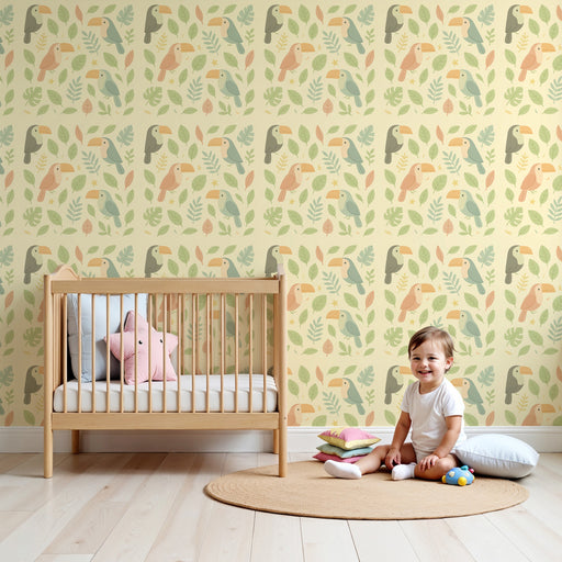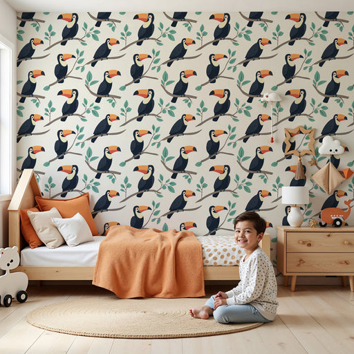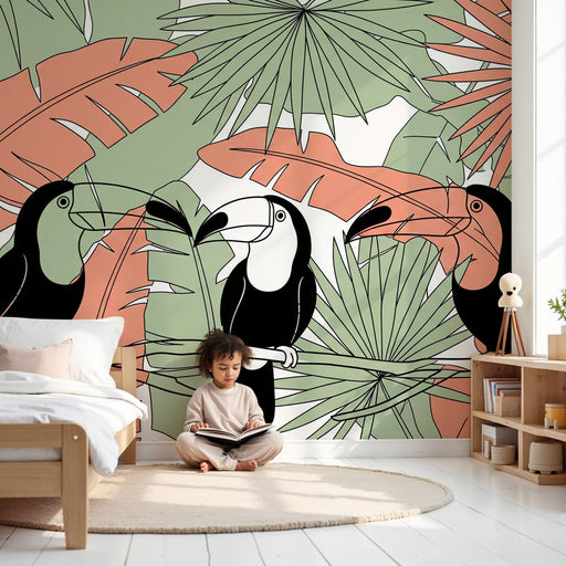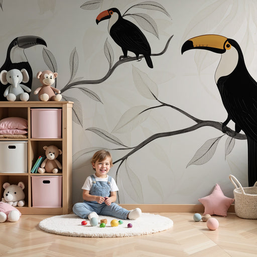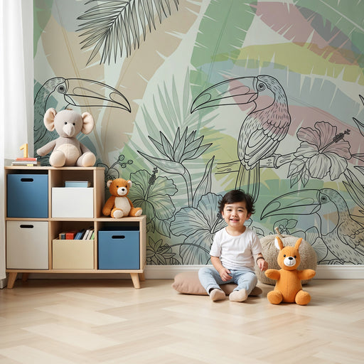 KidsWallFörnya ditt barns rum med denna barntapet med majestätiska tukaner. Dessa ikoniska fåglar, gömda bland frodiga tropiska blad, kommer att lysa upp r...
