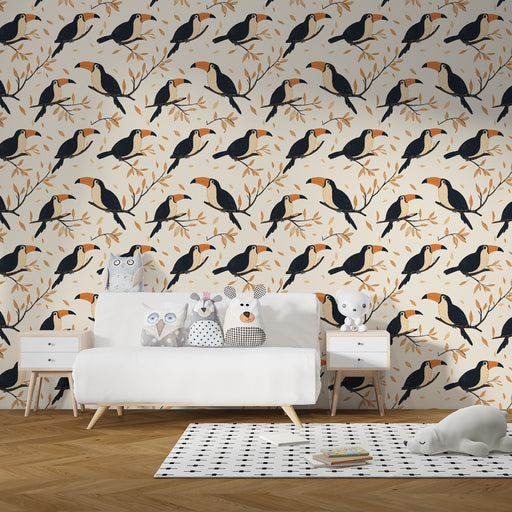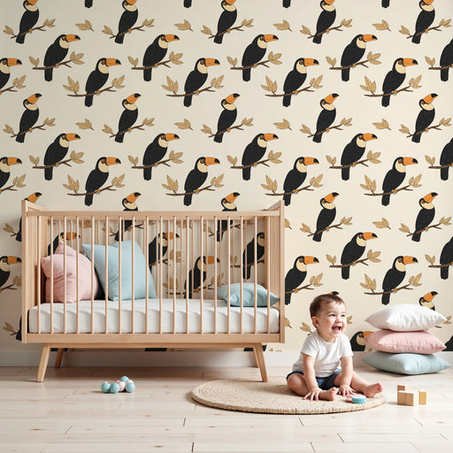 Visa alla detaljerBarntapet med mönster | Eleganta tukaner på beige bakgrund