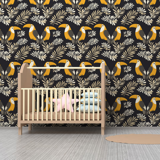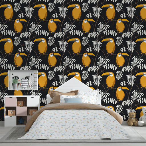 Visa alla detaljerBarntapet med mönster | Tukaner på svart bakgrund