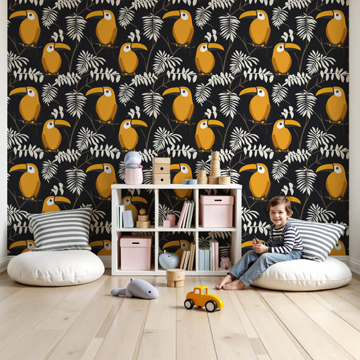 Visa alla detaljerBarntapet med mönster | Glada tukaner på svart bakgrund
