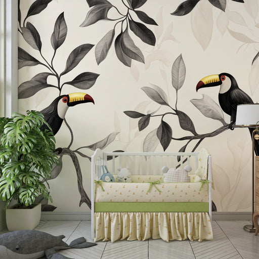 Visa alla detaljerBarntapet | Exotiska tukaner och monokromt lövverk