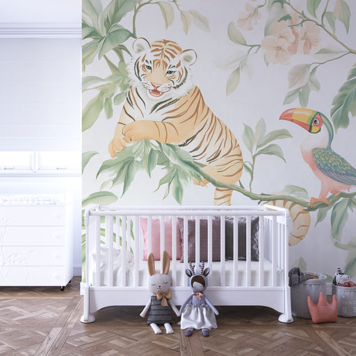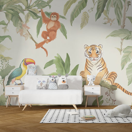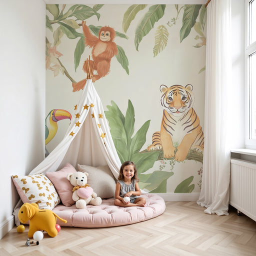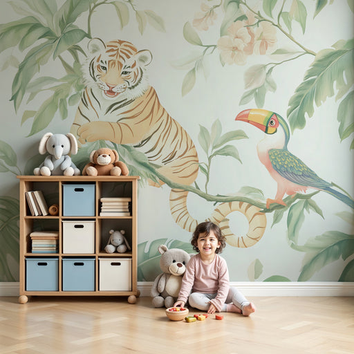 KidsWallErbjud ditt barn en resa till hjärtat av en glad och lugnande djungel med denna barntapet. Föreställ dig en värld där en leende tiger vilar på en g...