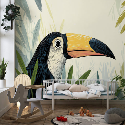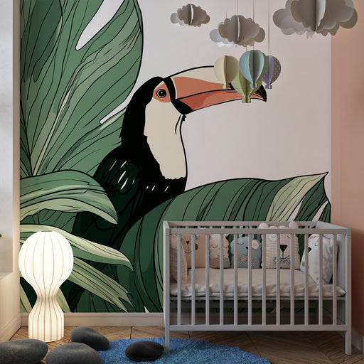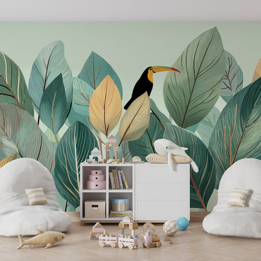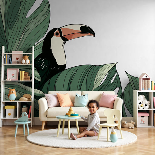 KidsWallDyk ner ditt barn i en levande värld med denna barntapet som visar en majestätisk tukan sittande på en gren. Omgiven av frodiga blad och lysande fr...