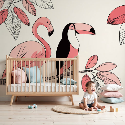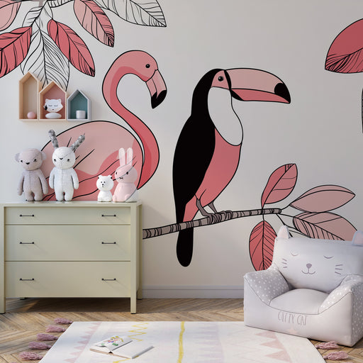 KidsWallFörnya barnets rum med denna barnrumstapet som ger en fräsch och färgglad touch med delikata flamingos och exotiska tukaner som sitter på en gren. ...