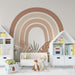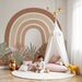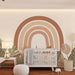 Omforma ditt barns rum till en alltför gullig plats med denna barntapet som kombinerar mjukhet och natur. En delikat regnbåge tar form i bakgrunden, omgiven av tropiska löv i lugnande gröna och terrakotta nyanser. Denna förtrollande dekor bjuder in till dagdrömmeri och lugn.