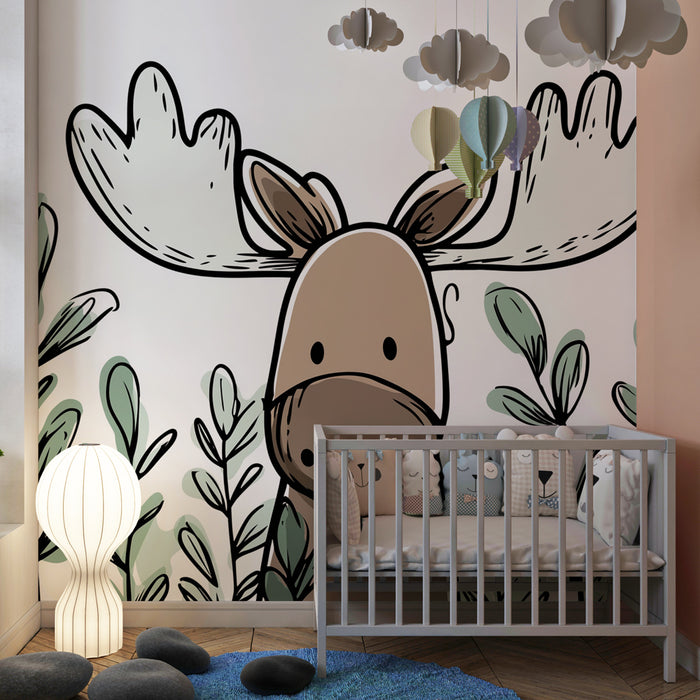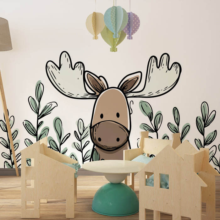 Lägg till en touch av natur i ditt barns rum med denna charmiga tapet som visar upp en bedårande älg omgiven av delikata växter. Denna älg, med sina stora horn och milda uttryck, skapar en vänlig och varm atmosfär som kommer att få de små att bli fängslade.