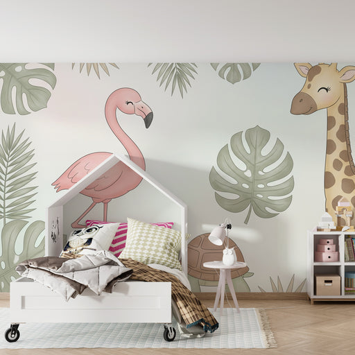 KidsWallGe barnrummet en touch av glädje och färg med denna barn tapet som illustrerar bedårande tropiska djur. En mjuk rosa flamingo, en leende giraff, en...