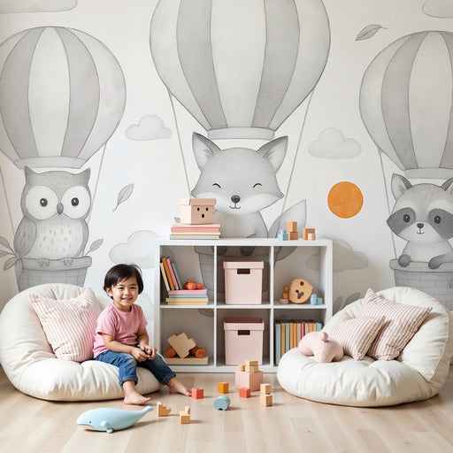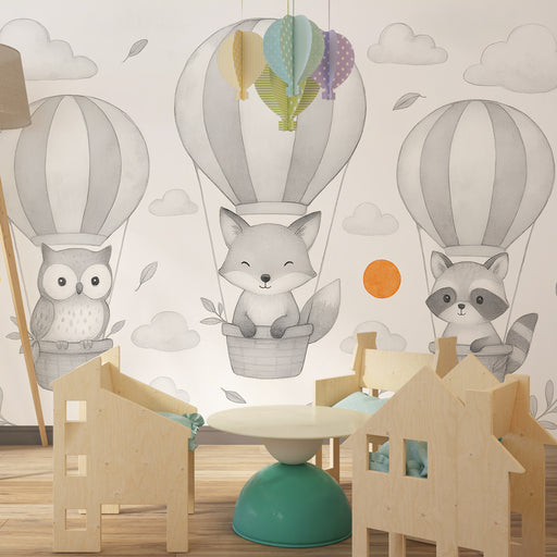 KidsWallGe dig ut på ett luftigt äventyr med denna barntapet som visar upp söta djur i färgglada luftballonger. En nyfiken uggla, en leende räv och en lekf...
