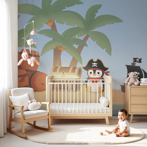 KidsWallGå med på ett otroligt äventyr med denna barn tapet som visar en bedårande piratpingvin på en tropisk ö. Omgiven av frodiga palmer, träfat och en s...
