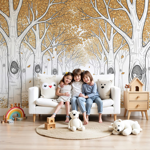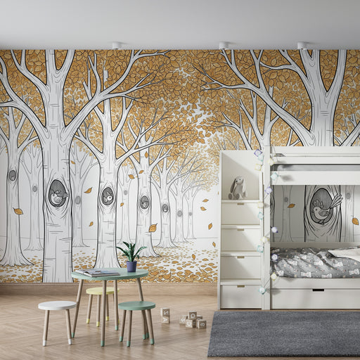 Visa alla detaljerBarntapet | Fridfull skog med fåglar och gyllene lövverk