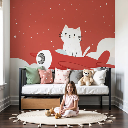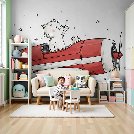 Visa alla detaljerBarntapet | Söt katt i en röd flygplan
