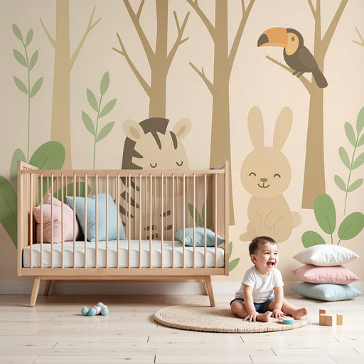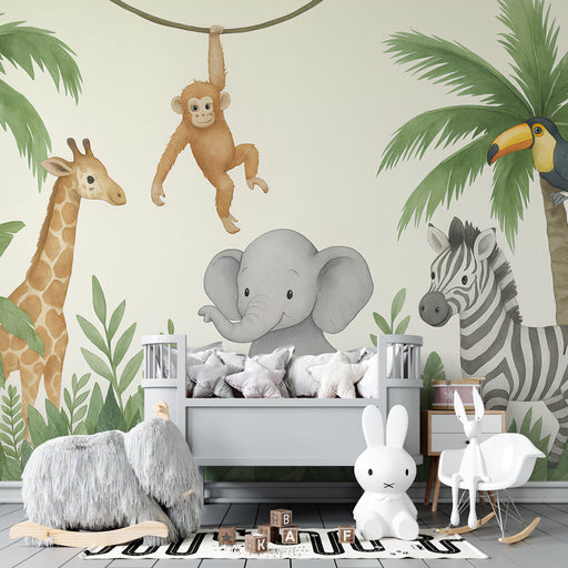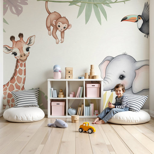Visa alla detaljerBarntapet | Bedårande djungeldjur i mjuka färger