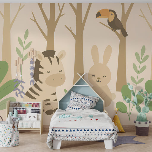 KidsWallOmvandla ditt barns rum till en oas av mjuk natur med denna barn tapet som visar upp bedårande djur i en varm skog. En lugn zebra, en glad kanin oc...
