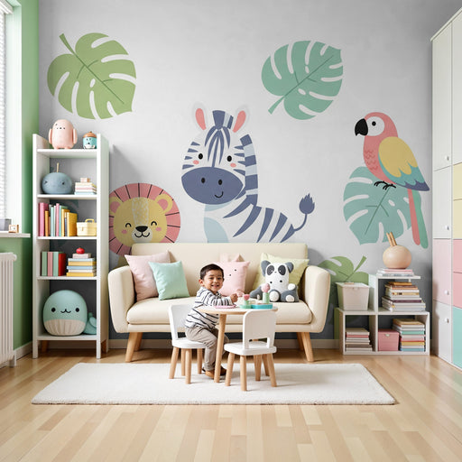 KidsWallOmvandla ditt barns rum till en lekfull och färgstark plats med denna tapet för barn som visar upp charmiga djur från djungeln. I mitten, en leende...