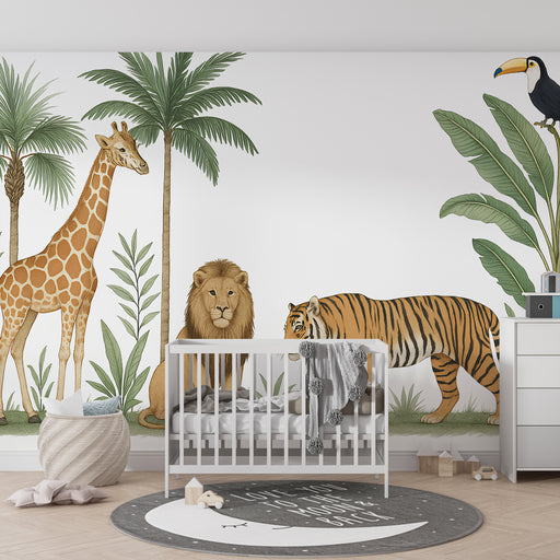 KidsWallFör in en touch av natur i ditt barns rum med denna barnrum tapet med bedårande djur i en tropisk miljö. En mjuk giraff, en leende lejon, en fridfu...