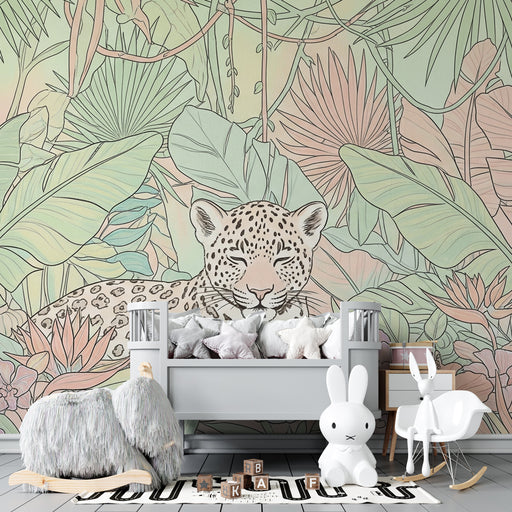 KidsWallFörvandla ditt barns rum med denna barn tapet som fångar uppmärksamheten, där en lugn leopard vilar mitt i en frodig djungel. Tropiska löv och blom...