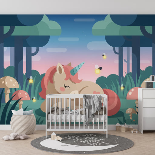 KidsWallDyk ner ditt barn i en magisk värld med denna barn tapet som visar en söt enhörning som sover fridfullt i hjärtat av en förtrollad skog. Omgiven av...